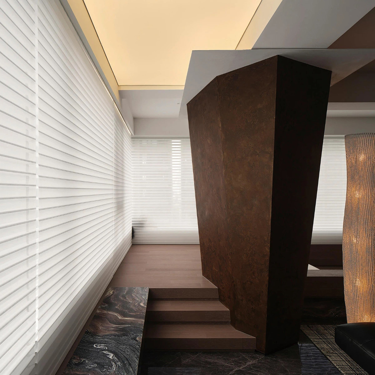 Die unregelmäßige Säule im Wohnzimmer, gestaltet in verschiedenen Nuancen von tiefem Rot, setzt einen subtilen metallischen Akzent. Dieser Effekt wird durch die Oberfläche „Sicilian Landscape“ von Novacolor erzielt – eine Textur, die von der Ruhe der sizilianischen Inseln inspiriert ist und visuelle Wirkung mit Harmonie verbindet, wodurch der Blick in die romantische Seele Italiens getragen wird.